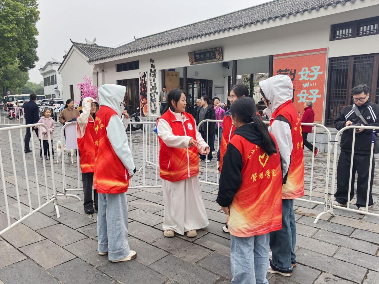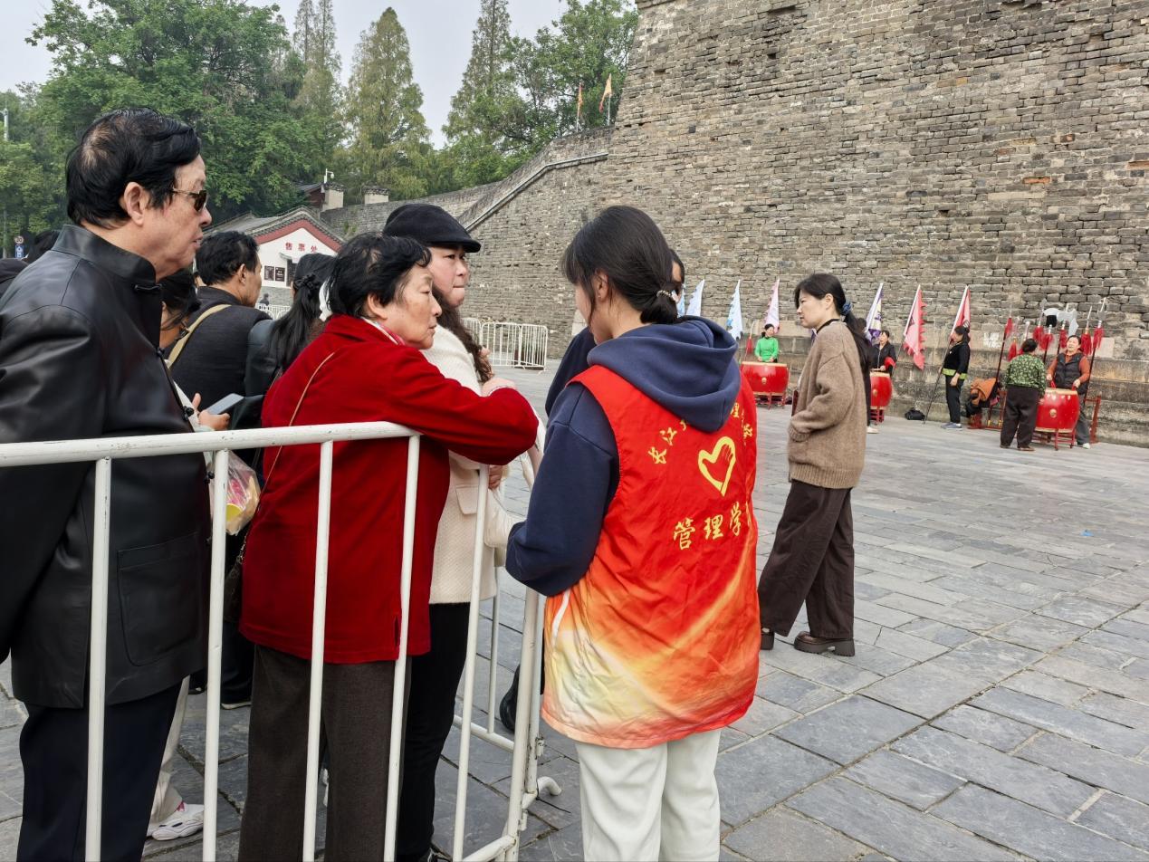 本网讯(通讯员 杨怡慧)10月24日和25日上午,荆州古城大北门,乐声悠扬,一场精彩的表演吸引众多市民驻足观看。为了保障演出的顺利进行,营造安全有序的观赏环境,管理学院青春健康科普志愿服务队的20余名志愿者们积极主动地参与,化身“秩序的守护者”,用实际行动护航演出进行。