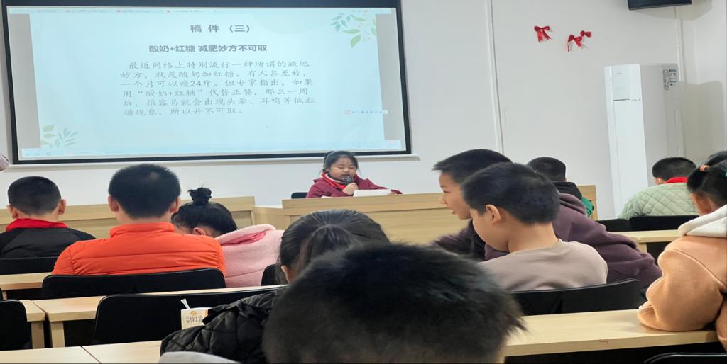 新闻主持实践课由社区邀请的老师主讲。课程从“什么是新闻”切入,通过“新闻要素小游戏”——用“时间、地点、人物、事件”四要素串联故事、“模拟新闻播报”等环节,引导孩子们掌握基础表达技巧。
