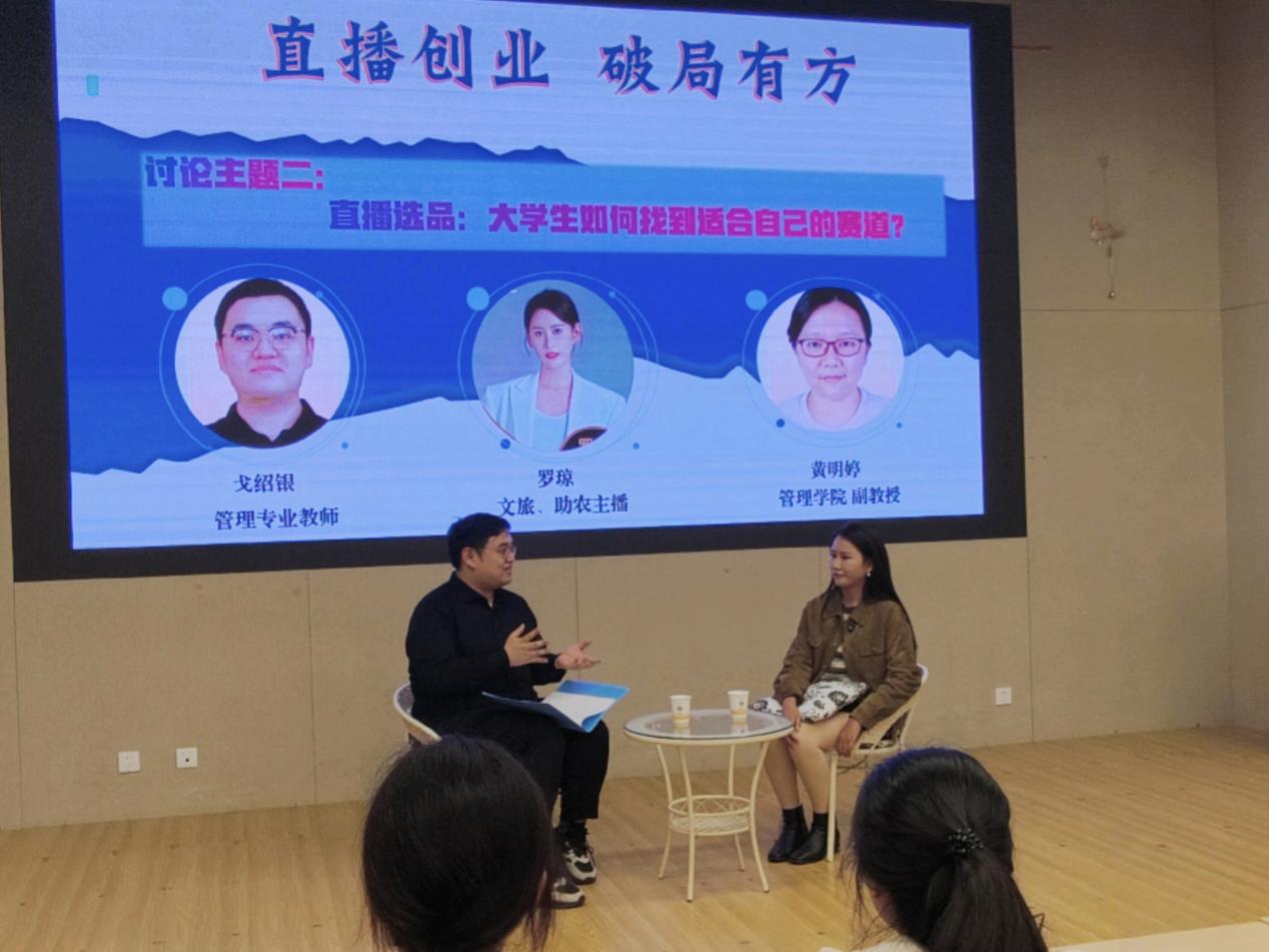 随后,专业主播罗琼与高校教师戈绍银开展了一场圆桌对话。二人围绕“短视频的‘下半场’:普通创作者还有机会吗?”、“直播选品:大学生如何找到适合自己的赛道”与“‘一人直播’VS‘团队作战’:如何低成本组建团队”三大核心议题,从学界与业界的不同视角出发,交流观点、碰撞思想。这场对话不仅搭建起“学界+业界”的交流桥梁,也为直播创业领域的产学研融合探索了新形式,切实帮助同学们将“创业想法”落地为“可执行方案”。