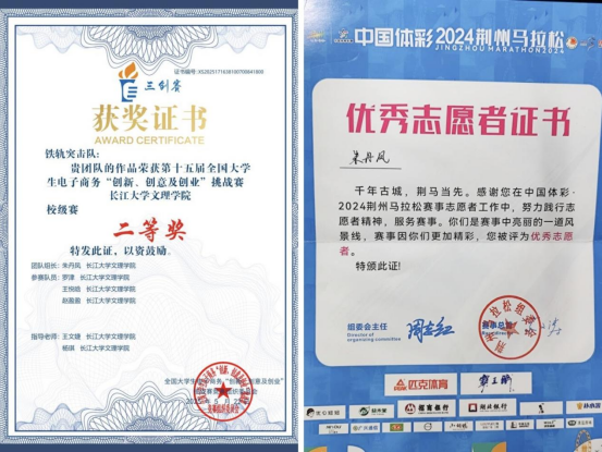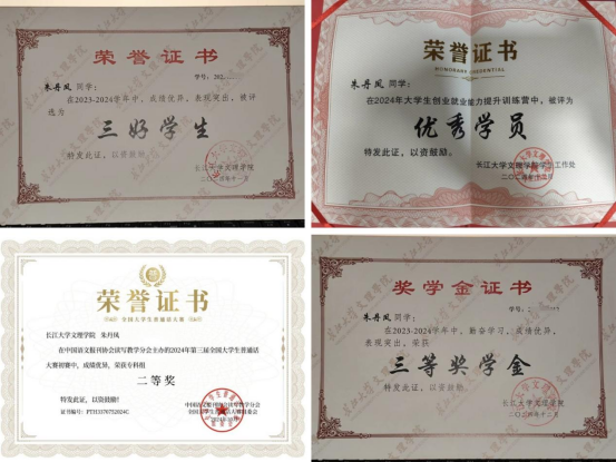 朱丹凤勇于挑战自我,积极参与各类学科与创新创业竞赛。她参与国家级大学生创新创业训练计划项目《湖北老字号品牌现状调研及分析——以荆州市为例》,带领跨专业团队协同攻关,提出“楚文化IP+老字号数字化”双驱动策略,荣获国家级立项。此外,她还获得中国国际大学生创新创业大赛省赛二等奖,全国大学生普通话大赛二等奖、三创赛校二等奖等多项荣誉。