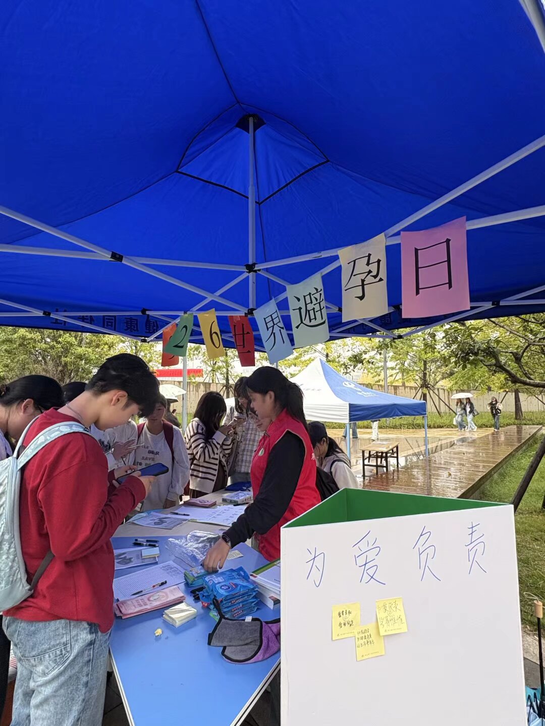 一旁的“为爱负责”签名承诺板前同样气氛热烈。同学们在了解世界避孕日的核心理念后,郑重签下姓名,并写下个人健康宣言贴于板上,共同许下对己、对伴侣健康负责的承诺。参与者还获得了一份精心制作的宣传折页,其中汇总了实用避孕知识及校内外求助渠道,确保了信息传递的延续性。