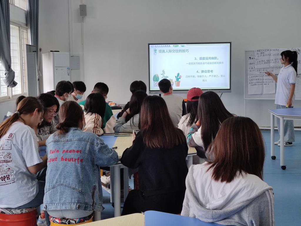 在活动开始前,主讲人石佳先让同学们玩了一个破冰游戏——大风吹。在游戏过后就开始进入本次活动的正题,石佳同学从不同的方面讲解了大学生人际交往的类型以及大学生交往的心理问题等内容。互动环节中主讲人设置的情景卡片,让同学们根据不同的情景想出不同的解决问题。第三组同学展示的是解决人际交往中不合群的问题,她们的代表发言人说到:“每个人都是独特的我们不必为了他人而改变自己,正是因为每个人的独特性才构成了这缤纷多彩的世界。”最后石佳同学也总结到:“人要生活就离不开社交,所以人际交往技能是我们每个人所必备的技能,希望大家能通过这个讲座能学会一些知识,运用到自己的日常生活中。