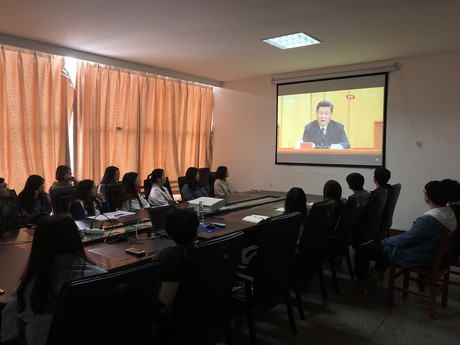 本网讯 今天(4月30日)上午10时30分,经法系组织各班团支书、学生党员、入党积极分子等25人在西校区集中收看纪念五四运动100周年大会。图为学生代表在经法系会议室聆听习近平总书记在大会上的重要讲话。通讯员 王震 摄影报道