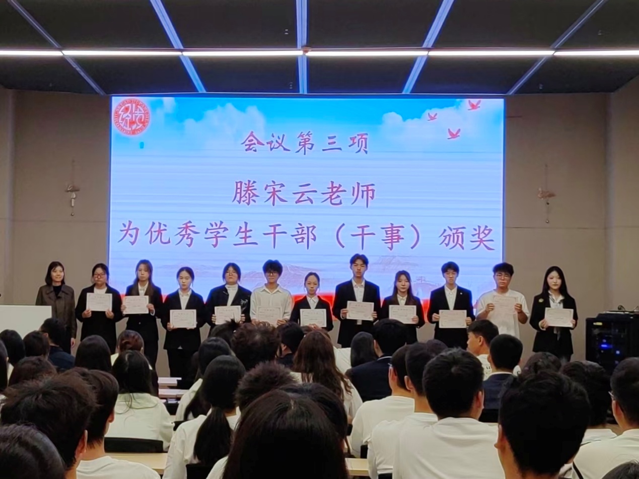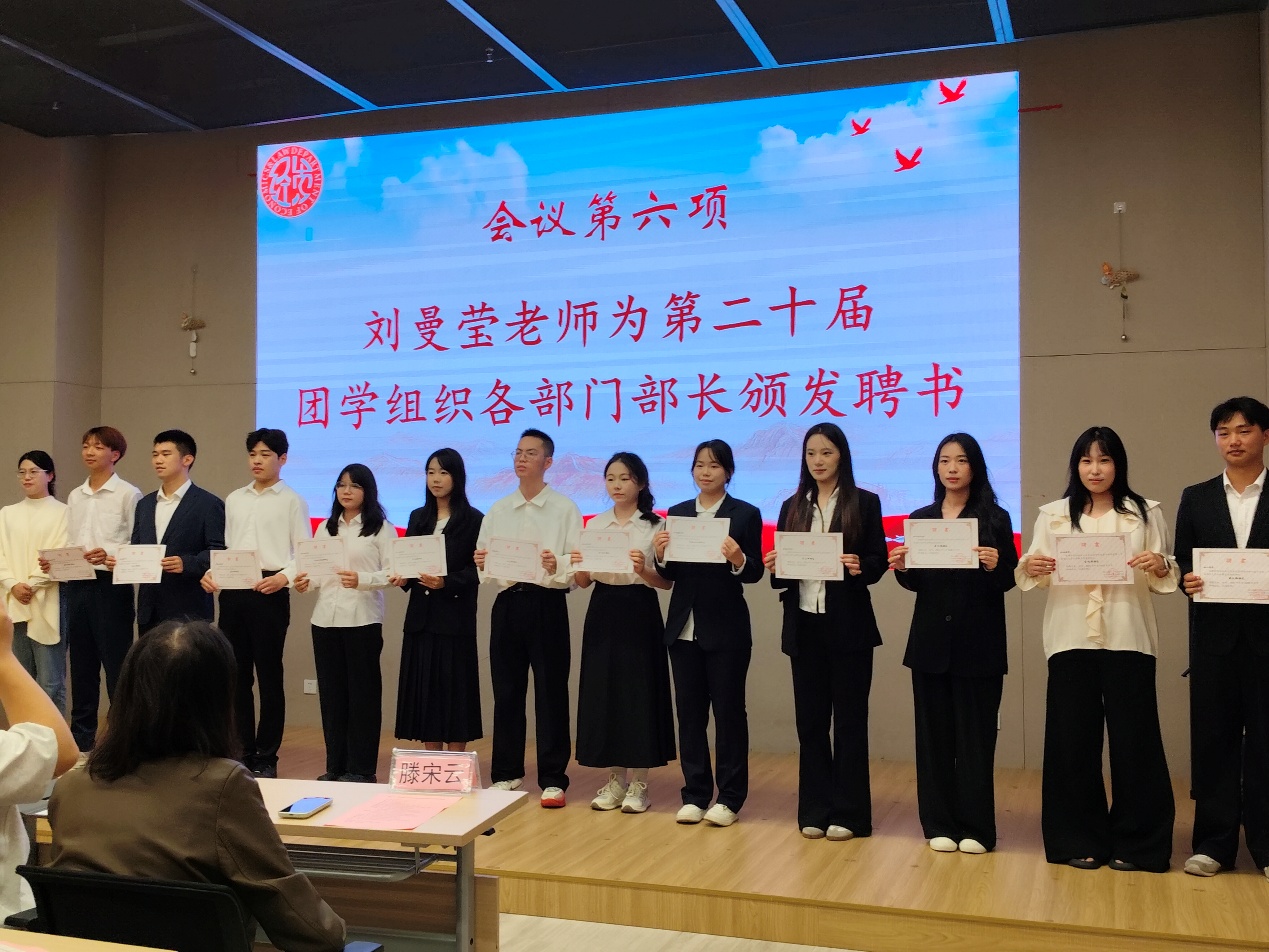 大会伊始,团总支指导老师卢佳智宣读表彰文件,对过去一年表现突出的学生干部予以高度肯定。滕宋云、杨杉杉和辛裕依次上台,分别为优秀学生干部及优秀部门颁奖。卢佳智、刘曼莹分别为第二十届团学组织主席团及各部门部长颁发聘书。随后,卢佳智宣读第二十一届团学组织主席团任命书,团总支学生兼职副书记骆灿宣读部长任命书。