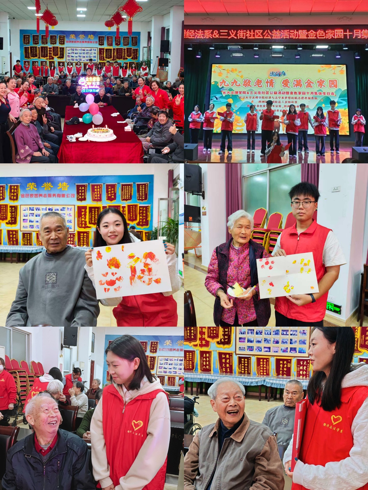 本网讯(见习记者:陈世行 张馨予)岁岁重阳,今又重阳。为弘扬中华民族尊老敬老的传统美德,传承重阳节深厚文化内涵,增强青年学生的人文关怀意识和社会责任感,经济与法学系延续重阳节志愿服务优良传统,于10月组织梦想起航志愿者服务队,先后走进荆州市沙市区金色家园老年公寓、荆州市荆州区城发康养城南御苑社区养老服务中心,开展主题敬老志愿服务活动,为老人们送上满含心意的节日关怀。