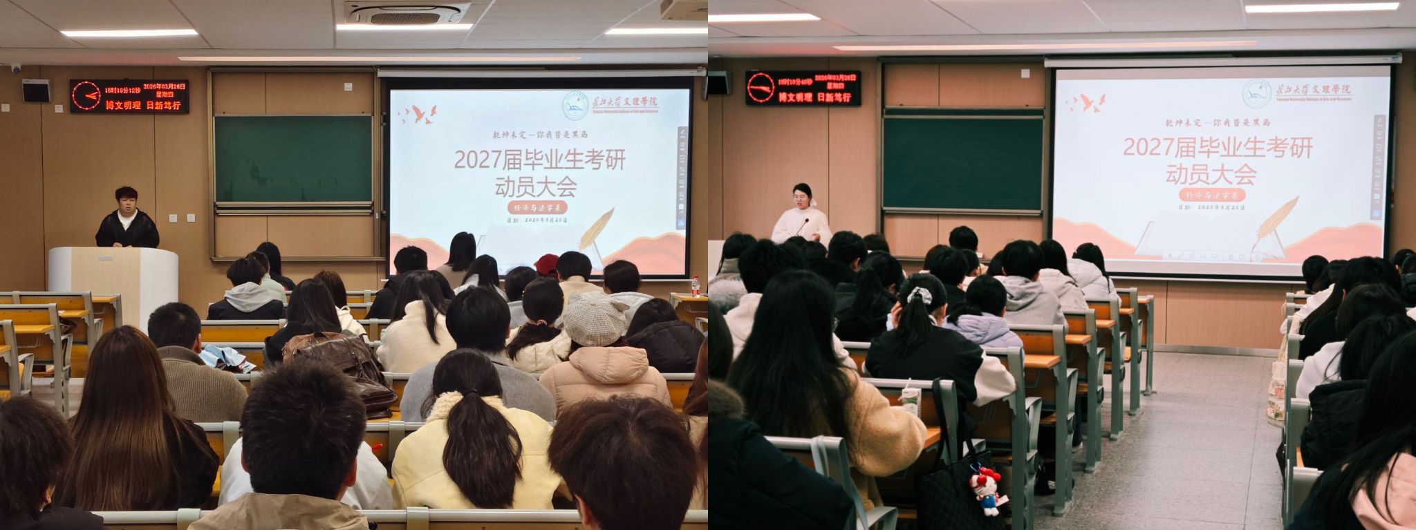 本网讯(见习记者:谭钱鑫)为促进经法系学生高质量充分就业,贯彻落实学院“两康一训”育人理念,3月26日下午,经法系在C-217、C-219教室隆重召开2027届毕业生考研动员大会。系领导班子成员,23级班主任出席动员大会。会议由辅导员卢佳智、刘曼莹分别主持。
