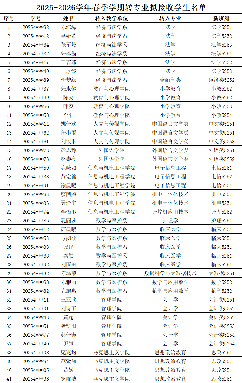 根据《2138acom太阳集团专业分流与转专业管理办法》(文理行发〔2025〕21号)文件精神,按照转专业相关工作要求,经学生本人申请、招生处及所在教学单位审核、申请转入教学单位综合考核、教务处复核,拟同意陈法璋等41名同学转入新专业学习,现将结果予以公示(见附表)。