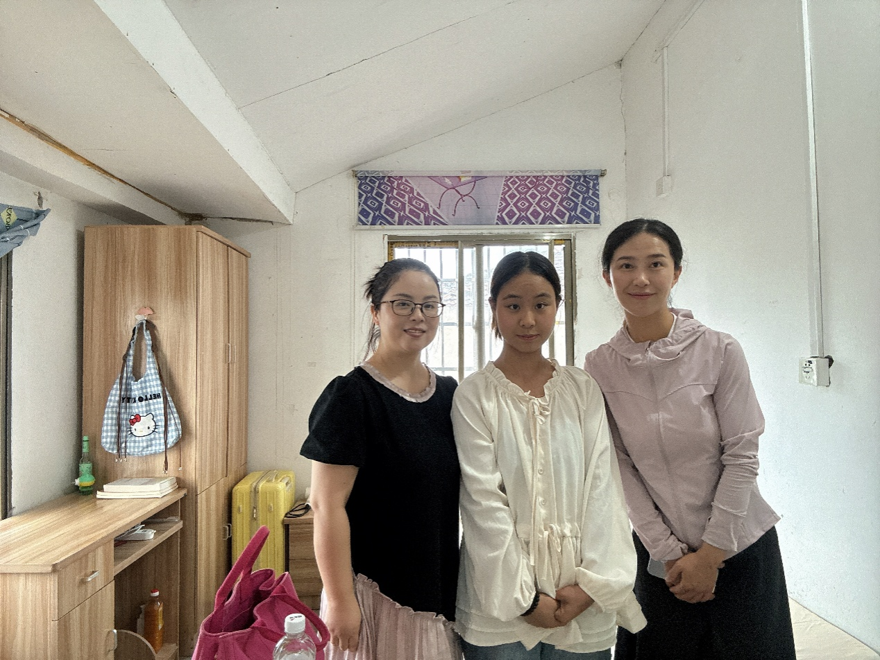 7月9日下午,党总支副书记梅曼曼与辅导员彭盼老师顶着酷暑,赴荆州区城南街道工民路走访学前教育S5242班学生代冰燕家庭。走进代冰燕家,简约整洁的陈设中,书桌上摆满的书本与复习资料格外醒目。家访中了解到,代冰燕作为独生女,面临不小的家庭压力:爷爷常年患病需长期服药,父母明年将达退休年龄,仍在家具行业务工,收入微薄且不稳定,仅能勉强支撑家用与医疗开支。但生活的挑战未磨掉她的乐观坚强,在校期间她勤奋刻苦、积极参与班级活动,还利用课余兼职补贴家用,从不抱怨难处。谈及未来,代冰燕眼神坚定:“我暑假留校复习考研,想深耕学前教育专业,走出大山成为幼儿园老师,用专业知识温暖更多孩子。” 这番话深深触动了老师们。梅曼曼详细介绍了学校奖助政策、考研资源与就业帮扶措施,彭盼老师则结合经验为她梳理复习计划、推荐备考资料,同时与家长深入沟通,缓解其升学就业顾虑。