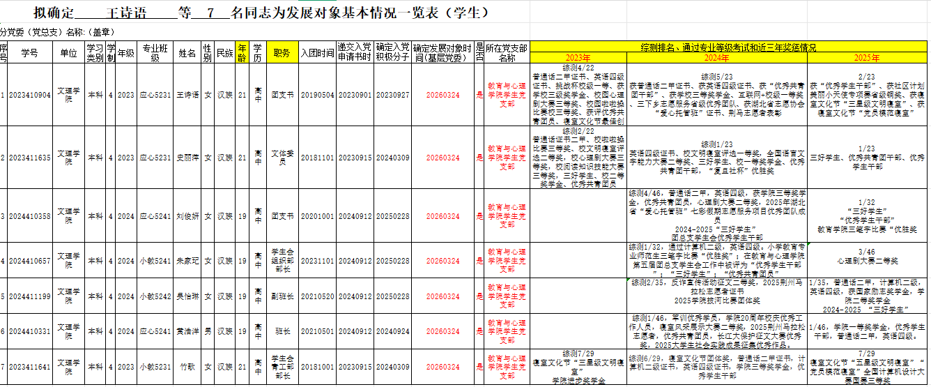 附:王诗语等7名同志为发展对象基本情况一览表