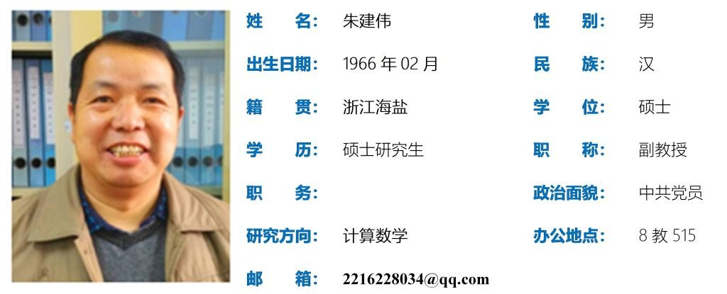 朱建伟,男,1966年02月出生,硕士研究生,副教授。主要研究方向:计算数学,参与科研项目三项;出版教材三部;获教学质量优秀奖三次。