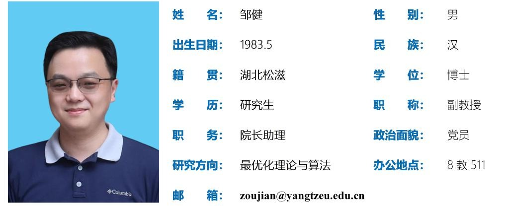 邹 健,男,1983年5月出生,博士研究生,副教授。主要研究方向为最优化理论与算法、图像处理;主持完成国家自然科学基金1项;发表学术论文30余篇,其中被SCI检索20余篇;获得长江大学教学质量优秀奖,长江大学科研立项贡献奖,长江大学优秀研究生导师,入选首届长江人才计划。