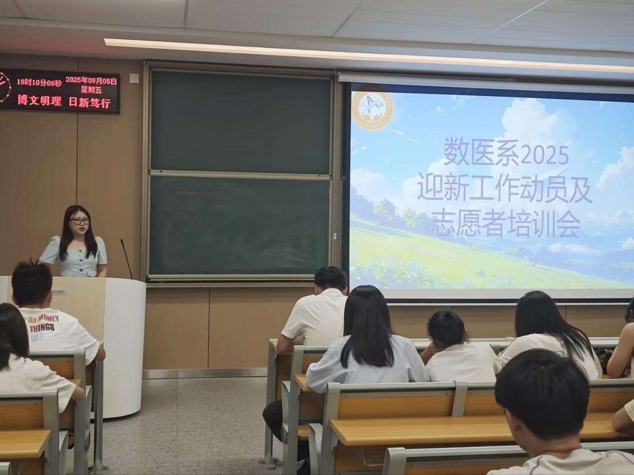 本网讯(见习记者李东霖)为确保迎新工作顺利进行,2025年9月6日19:00,我系在教学楼A-104召开2025迎新工作动员及志愿者培训会,参会人员有数医系党总支副书记燕梦蝶、辅导员聂志以及迎新志愿者们。