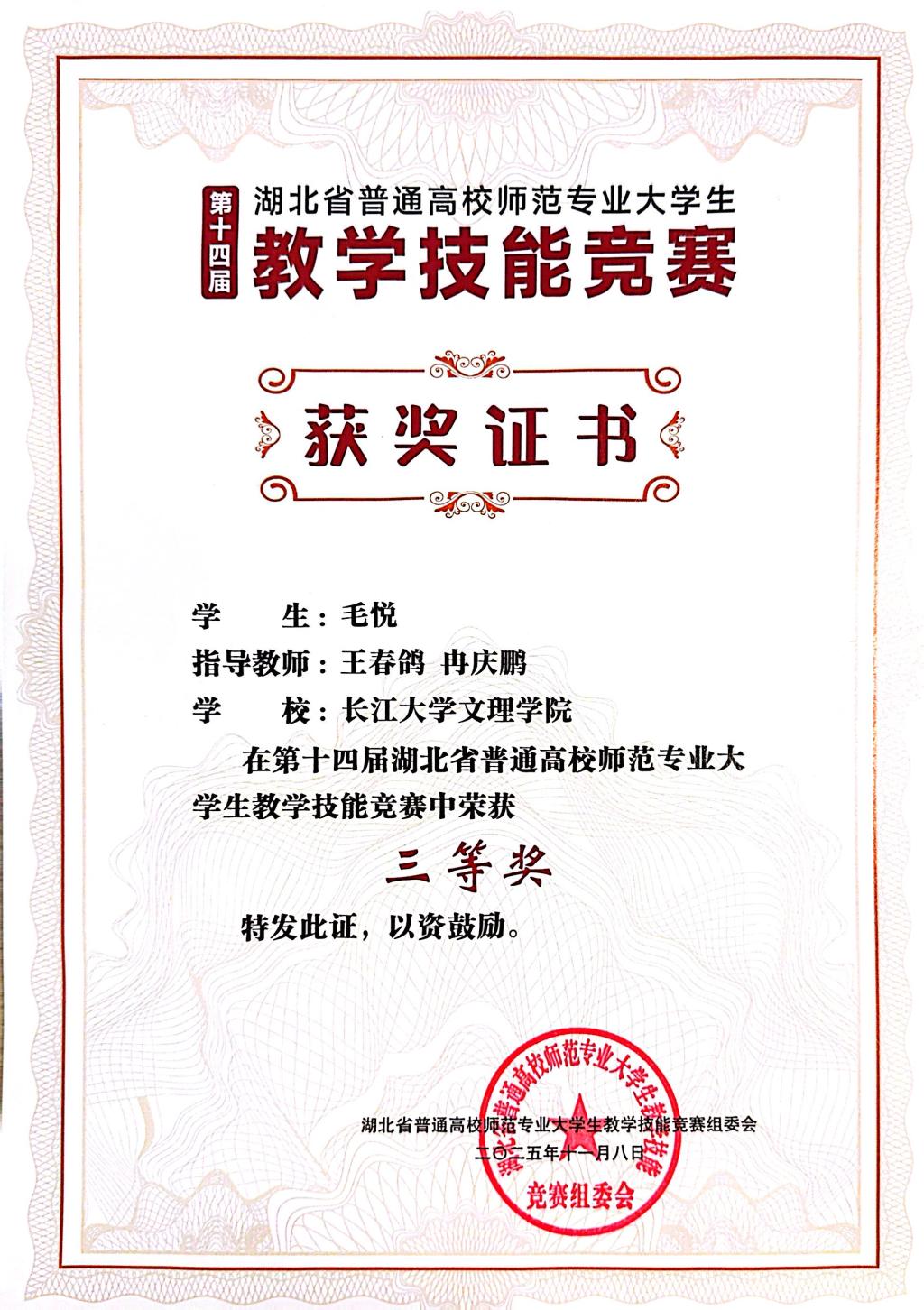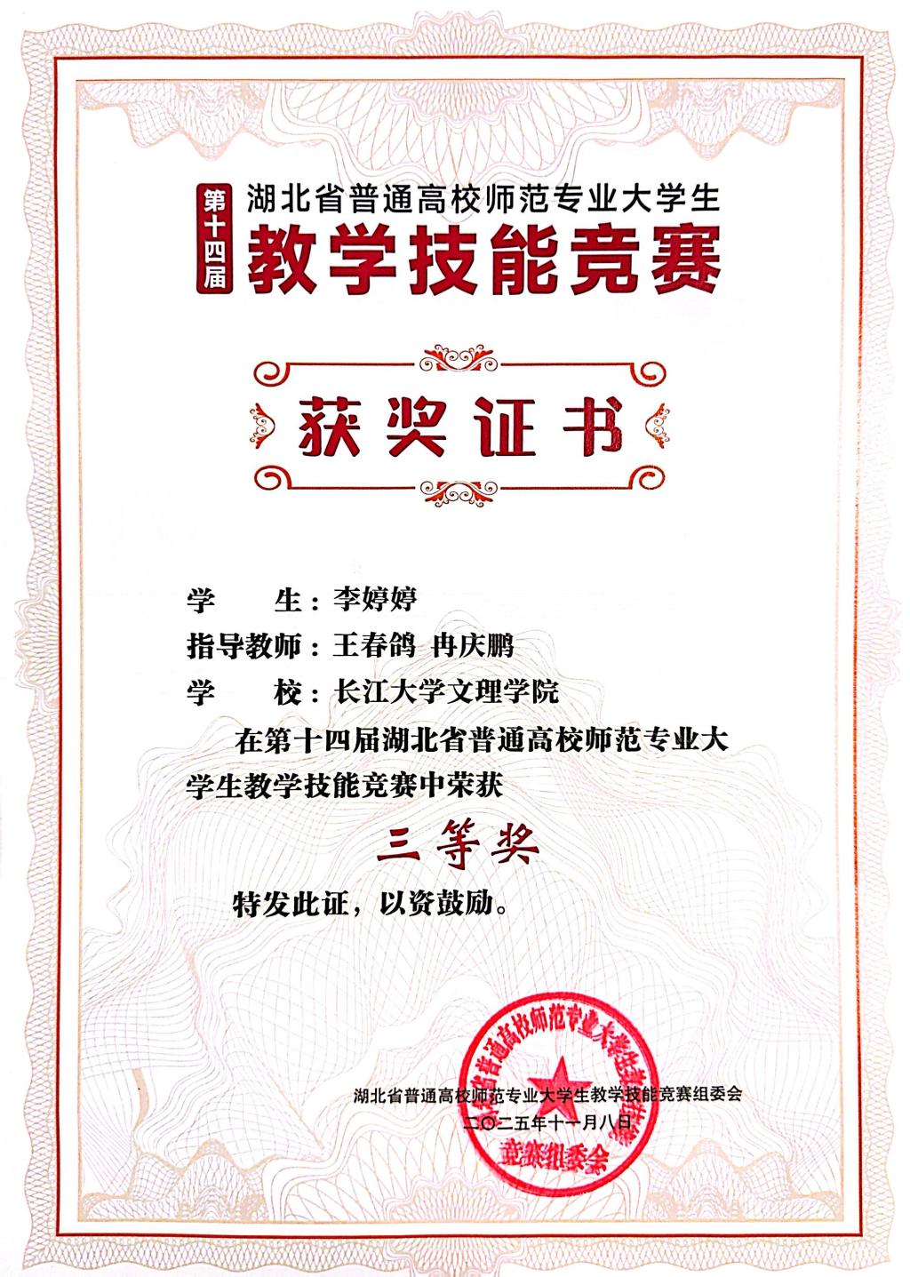 2025年11月8日,第十四届湖北省普通高校师范专业大学生教学技能竞赛决赛在华中师范大学圆满落幕,本次竞赛共有全省16所高校227名学生参加比赛。我系学子凭借扎实的专业素养与出色的教学表现,斩获多项荣誉。李婷婷获得初中数学组三等奖、毛悦获得高中数学组三等奖。