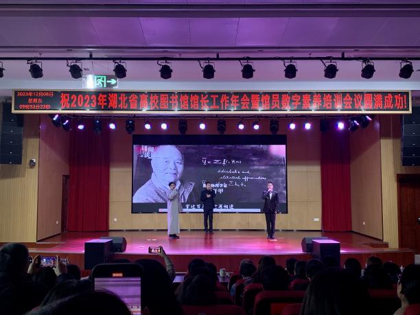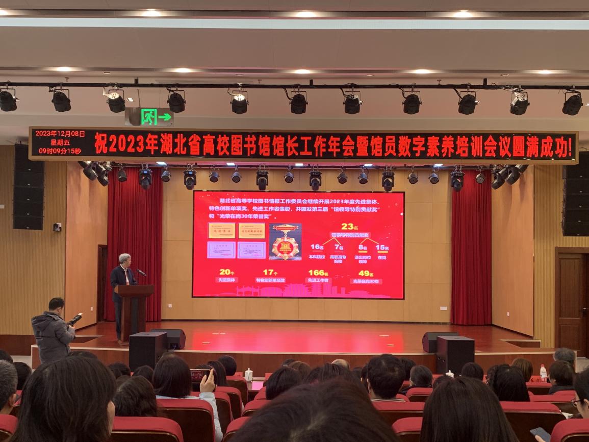 闭幕式环节,举行了2023年度湖北省高等学校图书馆先进集体及个人表彰,包括先进集体奖、年度特色与创新单项奖、年度先进工作者、馆领导特别贡献奖等多项荣誉,图书馆馆长让华获得湖北省高校图书馆第三届“馆领导特别贡献奖”。