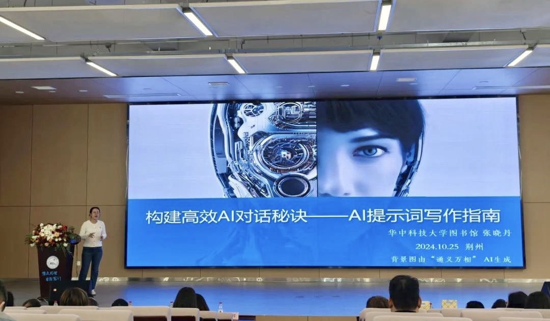 华中科技大学图书馆馆员张晓丹分享主题报告《构建高效AI对话秘诀——AI提示词写作指南》。她强调了在构建高效AI对话中提示词的重要性,介绍了提示工程技术及其应用,并分享了相关工具的使用方法和注意事项。