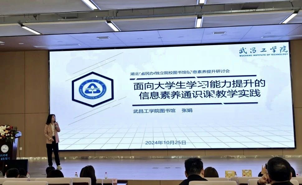 武昌工学院图书馆副研究馆员张娟分享主题报告《面向大学生学习能力提升的信息素养通识课教学实践》。她以武昌工学院图书馆开展的信息素养通识课为例,介绍了课程的建设、面临的挑战、教学方法的创新,并强调了信息素养教育的持久性和影响力。