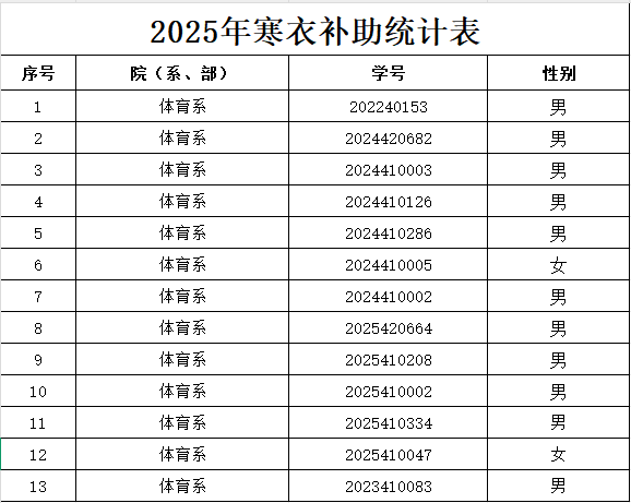 根据学院《关于做好2025年寒衣补助发放工作的通知》要求,拟定以下13名同学获得2025年寒衣补助金,现向全系公示,具体名单见附件。如对结果有异议者,请本着实事求是的态度,在公示期内向体育系反馈,反馈的事项要有事实依据。