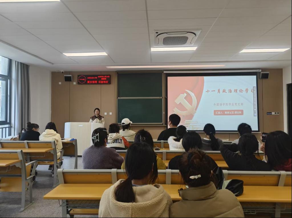 本网讯(通讯员 谭云秋)2025年11月13日下午14:30 外国语学院学生党支部在教室C-219开展十一月主题党日和政治学习。此次活动由黄孝乂爻同志和谭云秋同志共同主持。