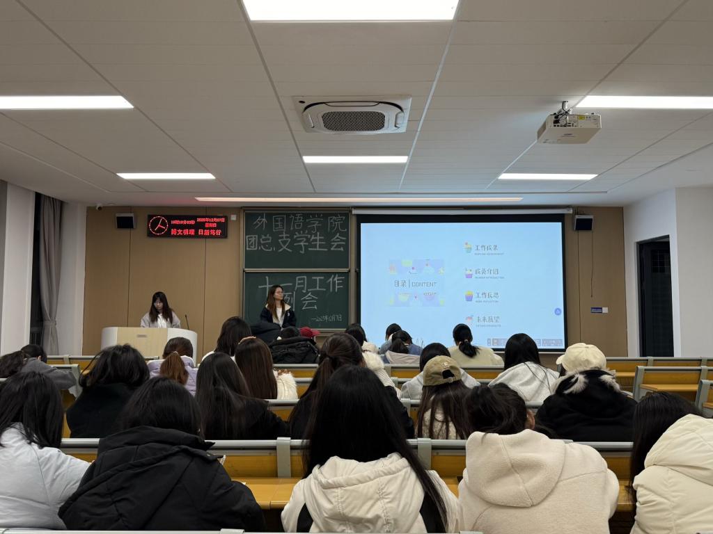 本网讯(通讯员 刘美慧)12月7日晚七点,外国语学院团总支学生会于01-A-308召开十一月工作例会。本次例会由学生会全体成员共同参与,旨在总结近期工作成效,检视存在问题,并规划下一阶段工作任务,推动学生会工作持续高效开展。