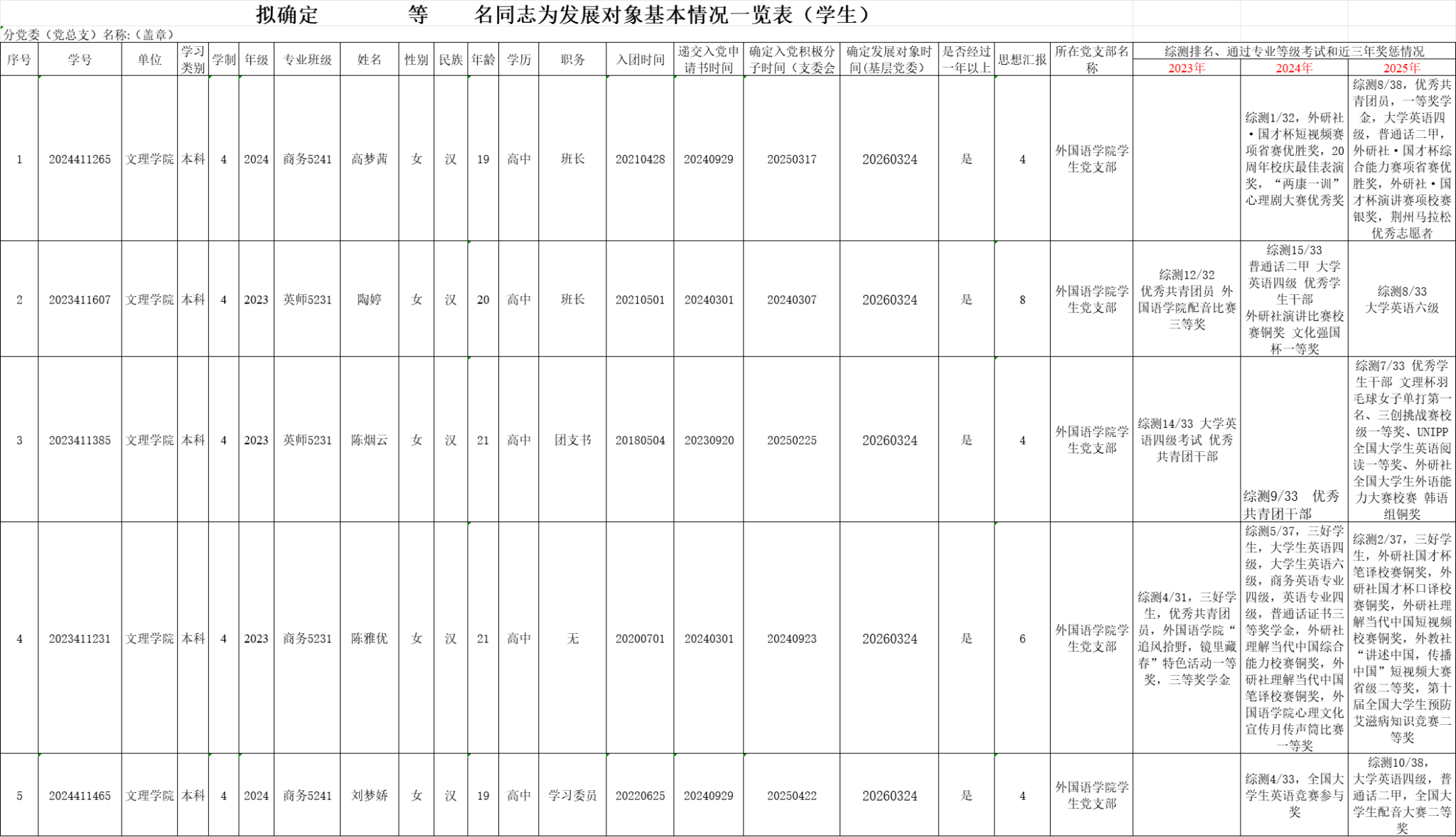 经党支部培养教育和考察,在听取培养联系人、党员和群众意见的基础上,经支部委员会会议讨论决定并报上级党委备案同意,拟确定高梦茜等5名同志为拟发展对象。待发展计划正式下达后,依据本院最终确定上半年发展计划数对公示序列依序核定最终发展对象。为保证发展新党员的质量,加强对发展党员工作的民主监督,现对发展对象进行公示。