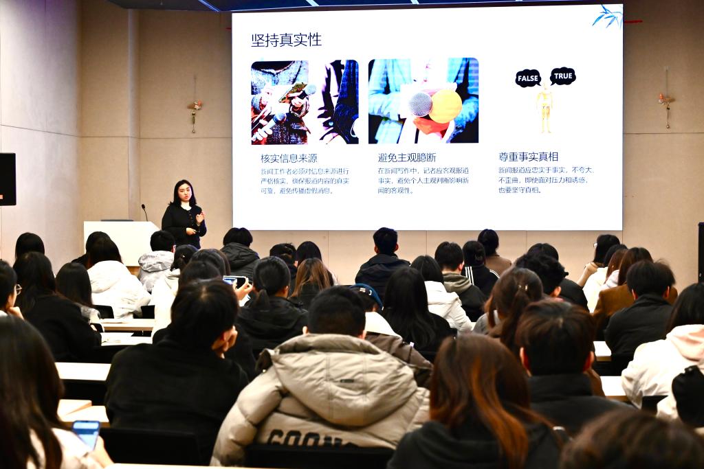 开营仪式后,党委宣传部部长周芳以《新闻写作》为题,为全体学生干部带来首场主题讲座。她结合高校宣传工作的实际需求,从“新闻写作的基本要求、新闻报道的基本体裁、消息写作”三个维度,系统讲解了新闻写作的核心技巧。周芳通过对比校园新闻案例,深入剖析了标题拟制、导语提炼、内容编排等关键环节的常见问题,并现场指导学生干部如何将“专业术语”转化为“通俗表达”,让新闻作品更具感染力和传播力。