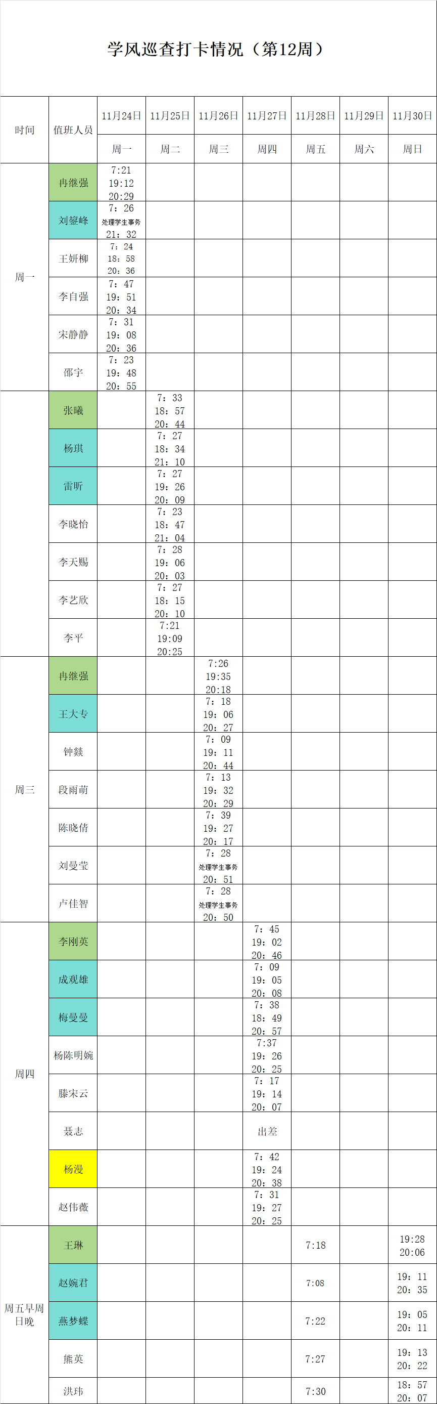 2025-2026学年第一学期第11-12周学风巡查打卡情况公示