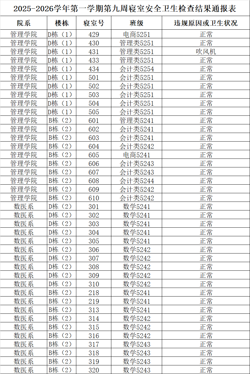 2025-2026学年第一学期第九周寝室安全卫生检查结果通报表
