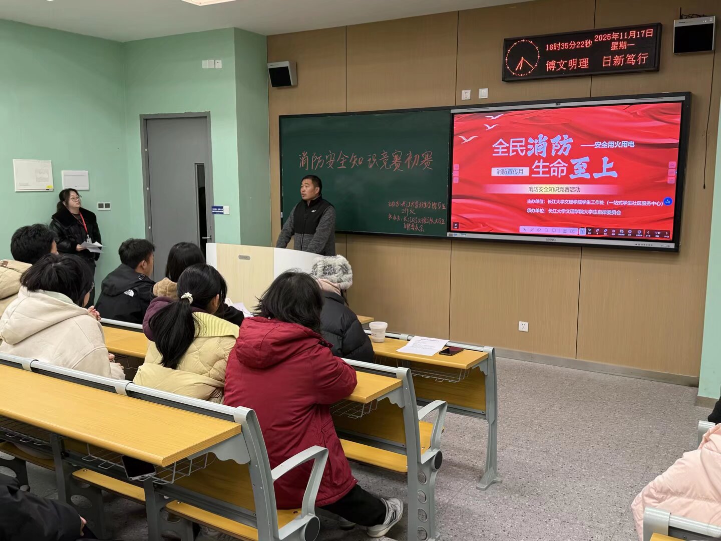 活动伊始,主持人综合办公室周静微以精炼的开场白拉开序幕,引入主题。冉老师作为特邀嘉宾登台发言,他强调了校园消防安全的重要性,指出消防知识是守护生命与财产的“安全阀”,希望同学们以此次竞赛为契机,把知识转化为日常防护的行动力,其恳切的话语为参赛选手们注入了十足的动力。
